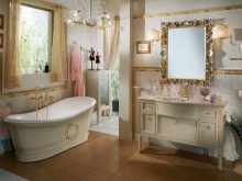 Devant vous, une salle de bain spacieuse dans un style classique. Les concepteurs ont choisi une tuile légère avec des motifs dorés.