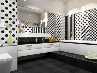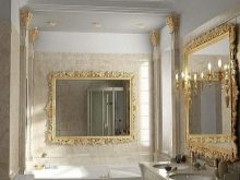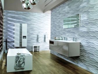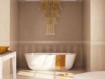 Pour un intérieur élégant et sophistiqué dans un style classique, deux types de carreaux sont combinés. Le lustre est utilisé pour le revêtement mural et le mat est posé sur le sol. Étant donné que cette direction est caractéristique argent et orla préférence est donnée au matériau de finition dans ces couleurs. Les carreaux blancs aux motifs brillants expressifs ont fière allure.