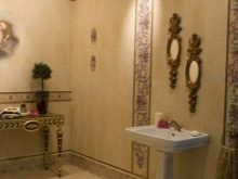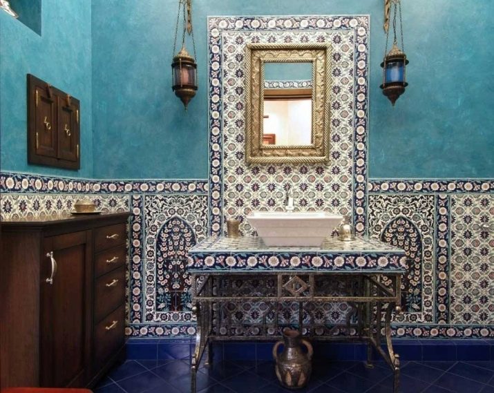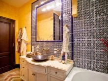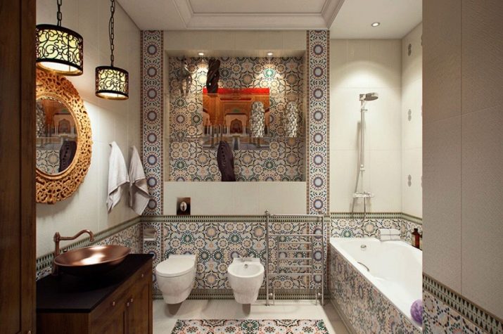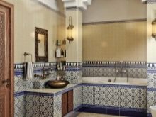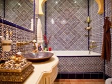 L'est chaud et captivant est devenu la base de la création d'un intérieur coloré. Lors de la conception d'une salle de bain dans ce style, des carreaux avec un motif sont souvent utilisés, qui sont souvent combinés avec des panneaux unis. Parmi l'assortiment riche, vous êtes sûr de trouver des carreaux avec des ornements thématiques (turc, arabe ou marocain). La décoration à motifs est utilisée pour décorer le sol et les murs. La grande demande a des panneaux de plancher d'un montant de 20x20 centimètres.