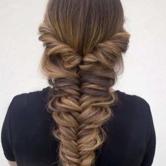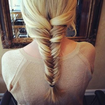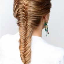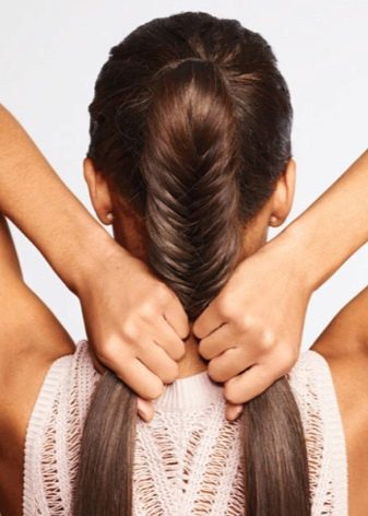 - Tissez la «queue de poisson» jusqu'au début du cou jusqu'à ce que tous les cheveux libres soient impliqués, déplaçant les brins latéraux vers l'intérieur.