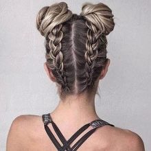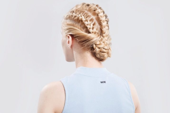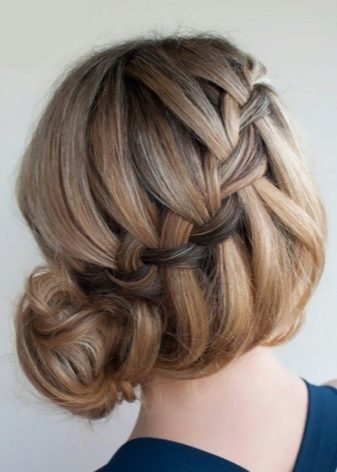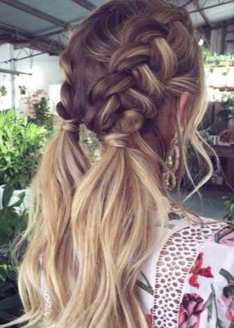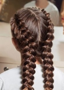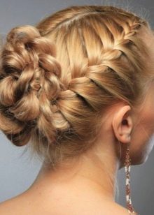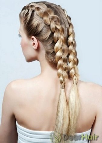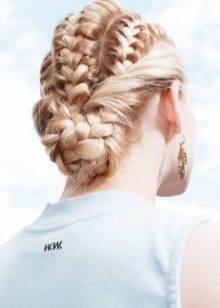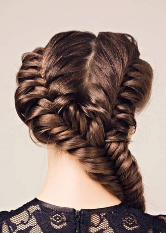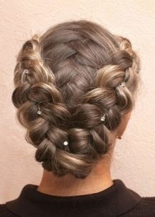 Pour une soirée, deux tresses peuvent être réunies en un paquet bas et décorées avec des épingles à cheveux décoratives ou une épingle à cheveux. Une telle coiffure sera élégamment combinée avec une longue robe en mousseline ou une tenue dans le style grec.