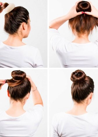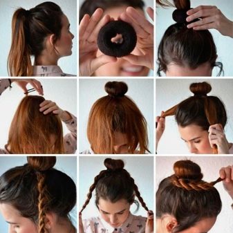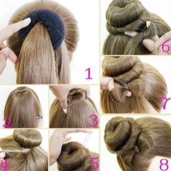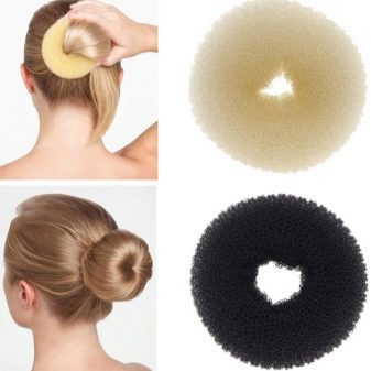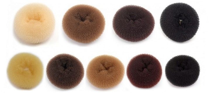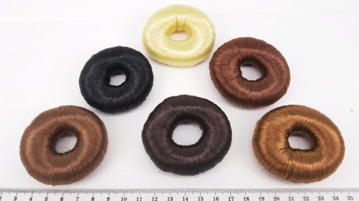 Le matériau est très similaire à un bagel classique. Souvent, les accessoires sont faits du même matériau. Ils ont la forme d'un rouleau régulier, mais des deux côtés il y a des attaches qui aident à former un rouleau dans un anneau, c'est-à-dire dans une forme commune pour un beignet. Tout d'abord, vous enroulez les cheveux sur un rouleau droit, puis formez les cheveux avec un paquet en un anneau.
