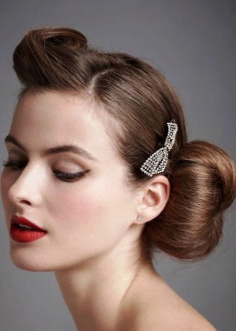 Bijoux assez populaires sur un bouquet lisse - épingles à cheveux avec de gros bijoux (par exemple, sous la forme de fleurs, d'étoiles, d'animaux et d'autres objets, les options sont trop diverses pour pouvoir en énumérer au moins la plupart). Des cheveux lisses et une épingle à cheveux brillante scintillant au soleil - et vous obtenez une belle image.