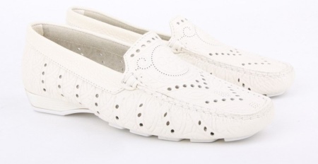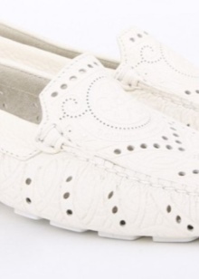 Hihetetlenül kifinomult és könnyű modellek teszik a kijáratot kényelmessé. Az elülső részén található perforált virágmintával ellátott gyönyörű fehér kézimunka minden nő számára vonzó. A tetején található széles bőr szél kiküszöböli a láb dörzsölését, a praktikus barna talp lehetővé teszi, hogy hosszú ideig megőrizze a termék eredeti megjelenését. A porózus bőr talpbetét higiéniai tulajdonságokkal rendelkezik, és kedvező mikroklímát biztosít a lábak számára. Az ilyen mokaszinok nem csak a rövidnadrágot vagy a farmert fogják kiegészíteni, hanem egy sifonból készült levegős ruhát is.