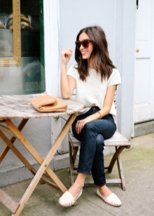A fehér mokaszinok többnyire nyári cipők, ezért ne viseljen vastag anyagból készült tárgyakkal. Farmer, pamut, sifon, selyem ruházat lesz a legjobb választás az együttes számára.