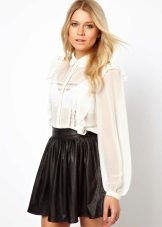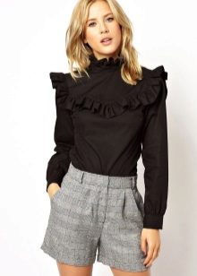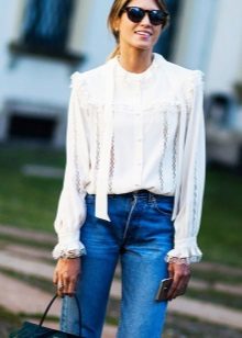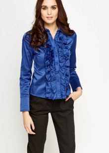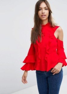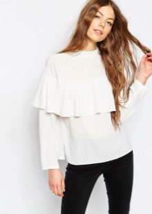 Una camicetta con volant sembra molto elegante. La manica lunga di questo modello non interferisce con l'apertura delle spalle e un taglio ampio o leggermente aderente sembra molto attraente. Le ragazze magre con il seno piccolo, queste camicette sono le più adatte, poiché i volani nascondono perfettamente un busto non troppo magnifico. Un'immagine con una camicia così diventa immediatamente sensuale e seducente.