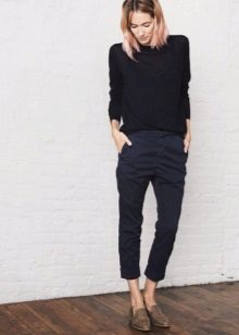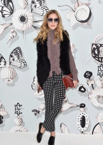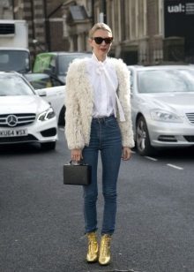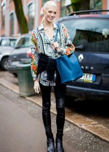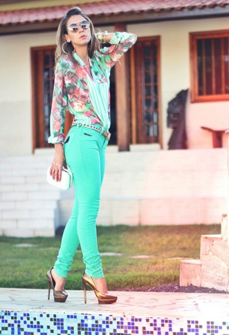 L'immagine, basata su un colore turchese, appare armoniosa ed elegante. La camicia a camicia stampata dona originalità e romanticismo, mentre i pantaloni attillati sottolineano la magrezza della figura. Una piccola clutch bianca, scarpe color rame e accessori completerà efficacemente il look.
