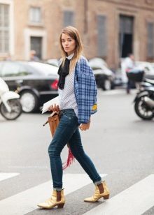 Una camicetta bianca e pantaloni di jeans sono un'ottima opzione per ritrovi intimi con gli amici o per fare shopping. La sciarpa di raso originale, come accento nell'immagine, la rende più interessante ed elegante.