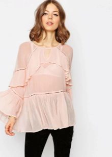Le camicette con volant suggeriscono di utilizzare solo tessuti leggeri e ariosi, ad esempio seta o chiffon. Tali modelli conferiscono all'immagine un'incredibile raffinatezza e ariosità. Proprio come i modelli con volani, una camicetta con volant aiuterà a risolvere il problema di un seno piccolo, mascherandolo con successo con il suo splendore e volume. Tali camicette saranno appropriate sia in una data che in ufficio, è importante solo scegliere il giusto colore e grado di trasparenza del tessuto.