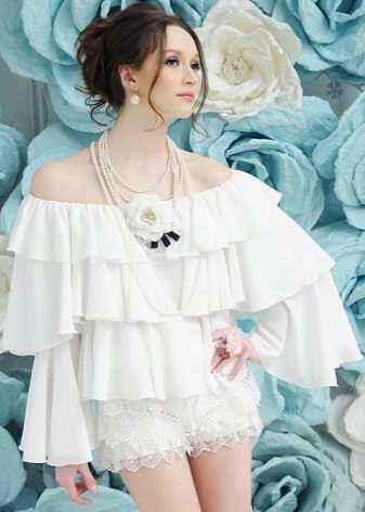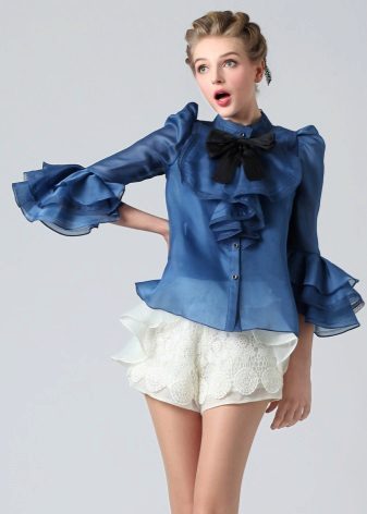 Le maniche a balze sembrano molto interessanti e intriganti. Nonostante il fatto che più spesso fungano da elemento di stile retrò, in combinazione con modelli di camicette alla moda, creano immagini molto alla moda e moderne. Le maniche a balze sembrano più impressionanti se realizzate in pizzo traslucido o tessuto di pizzo.
