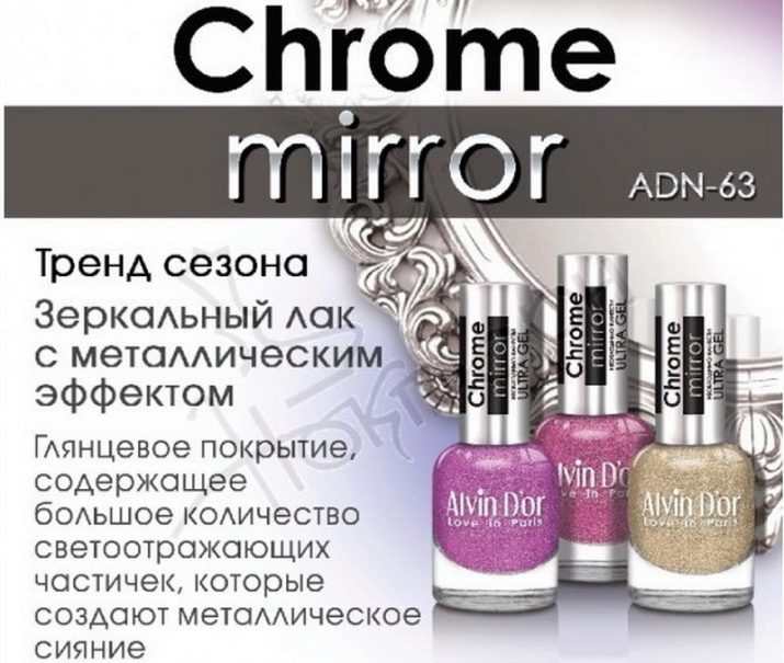 - Mezzi per nail art dalla collezione Specchio cromato ADN-63, sicuramente piacerà alle donne. A causa della presenza di particelle riflettenti nella sua composizione, ha un bell'aspetto sulle unghie, piacevole con la sua lucentezza a specchio metallico.