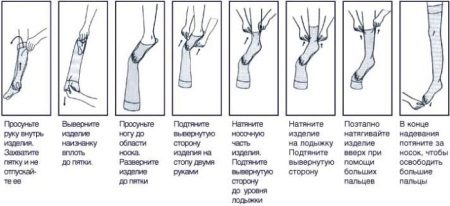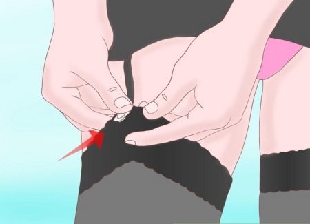Per prima cosa devi installare correttamente la punta della calza, quindi tirare lentamente sopra la gamba. Quando la calza viene indossata per la lunghezza desiderata, è necessario raddrizzare l'elastico sulla parte superiore. Quando indossi una calza, devi fare molta attenzione a non stringere accidentalmente le unghie.