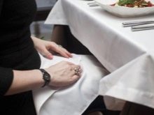 - Su un tavolo festivo allo stesso tempo dovrebbero esserci sia tovaglioli di stoffa che carta. Ciò è dovuto al fatto che i prodotti in tessuto sono destinati esclusivamente affinché le persone non macchino i vestiti, non si puliscano le mani, poiché questa è considerata una cattiva forma. Le opzioni di carta sono usa e getta, gli ospiti possono usarle a loro discrezione.