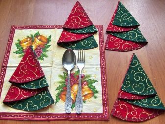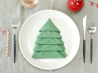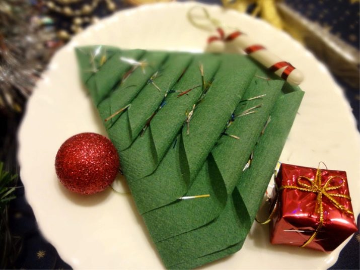 È un modo molto insolito ma semplice Tovagliolo di carta natalizia. Questa opzione è perfetta per un tavolo festivo di Capodanno o Natale. Per fare questo, avrai bisogno di tovaglioli di carta di dimensioni standard ordinarie, il colore può essere qualsiasi, ma le opzioni verde o rosso appariranno più colorate, il che creerà immediatamente un'atmosfera festosa sul tavolo.