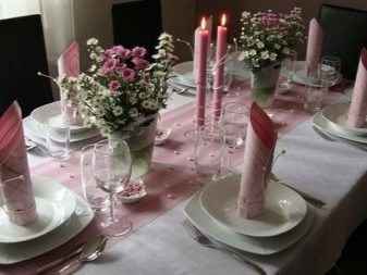 Puoi decorare la tavola per le vacanze delle donne con una tovaglia morbida e leggera con tovaglioli a contrasto in bicchieri da vino. La loro installazione può essere eseguita con uno dei metodi che ti piacciono o ti vengono in mente.