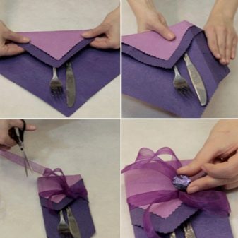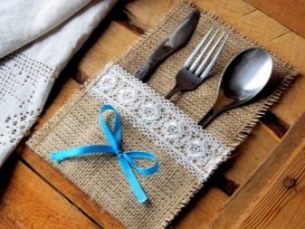 Le posate in una "busta" di tela, decorata con fiocco e pizzo decorativo, sembrano molto originali. Tuttavia, molto spesso tali buste vengono cucite.