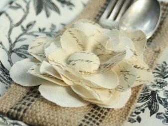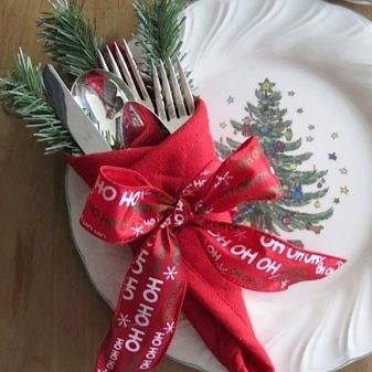 Originale e senza sforzo, puoi decorare le posate separatamente.Per fare questo, devi solo legarli a forma di sciarpa con qualsiasi panno di straccio. Questo è molto facile da fare, ma è auspicabile che il tessuto sia il più leggero e arioso possibile.