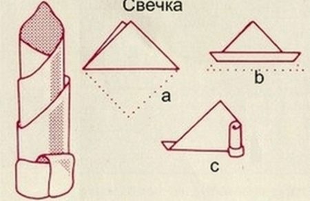 Carta molto facile da montare un tovagliolo a forma di candela. Per questo, è meglio usare tovaglioli di carta di grandi dimensioni. Possono essere monofonici e con piccoli schemi: