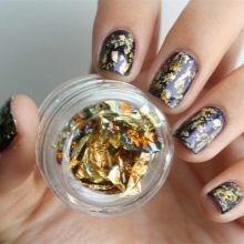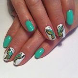 - Usando un foglio per la fusione. Avrai bisogno di smalti colorati. È meglio scegliere sfumature di verde, turchese e frutti di bosco che si avvicinano allo stile ecologico. Il disegno viene applicato con cura con vernice gel. Dopo che si asciuga leggermente nella lampada, è necessario stampare la pellicola nella figura. Una volta completato il disegno, è necessario applicare una mano di finitura. Tali opzioni sembrano eleganti, attraenti e molto impressionanti, sottolineando l'immagine individuale.