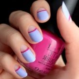 - Manicure con spazio negativo. Questa opzione ha sempre un aspetto elegante e alla moda. Tuttavia, la sua implementazione richiederà competenze speciali. Dovresti disegnare un'immagine, quindi applicare lo smalto gel, senza andare ai suoi bordi. Se non sei sicuro delle tue capacità, allora è meglio contattare un esperto maestro di nail art. Successivamente, applica uno strato superiore e fissa tutto nella lampada. L'enfasi è preferibilmente su una o più dita.