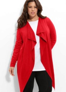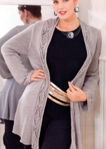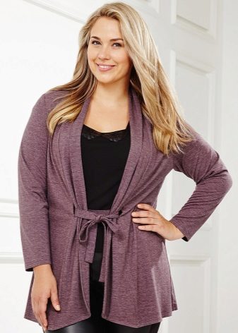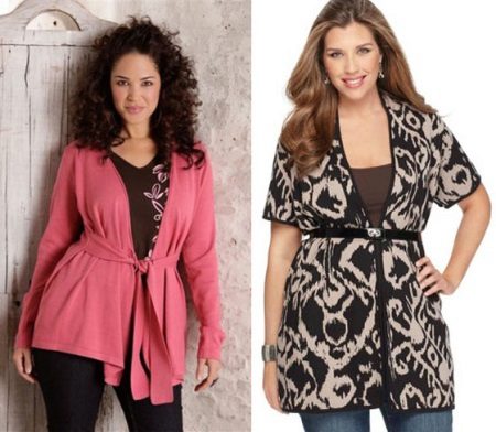 I modelli di cardigan senza bottoni o altri elementi di fissaggio sono molto popolari tra le ragazze con una completa completezza, poiché tali stili hanno spesso una cintura o una cintura che ti consente di nascondere una piccola pancia. Se il problema principale della figura è la mancanza di una vita, quindi usando una cintura puoi distinguerla visivamente e renderla più sottile posizionando la cintura appena sopra la vita naturale.