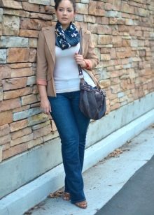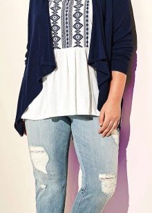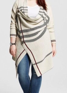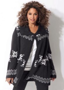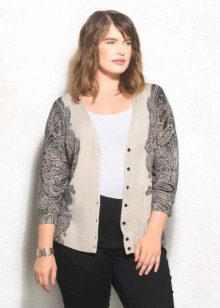 Un'ottima opzione per ragazze complete: cardigan con stampa verticale. Può essere un motivo completamente diverso: forme geometriche, motivi in stile etnico o semplicemente inserti colorati. Questa tecnica di progettazione renderà la tua silhouette molto più sottile, modificando significativamente le proporzioni.