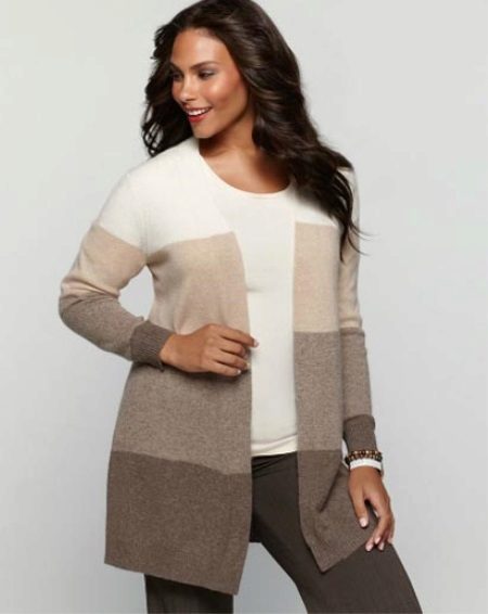 Se la tua figura ha diversi chili in più, allora molto probabilmente nel tuo guardaroba prevalgono le tonalità di nero o scuro, perché il noto postulato che il buio è magro, saldamente bloccato nella nostra testa. Ma quando si sceglie un cardigan, consigliamo vivamente di abbandonare questa regola e di permetterci di acquistare una cosa di colore brillante. Ma se non riesci a immaginarti in un audace cardigan rosa o verde succoso, prendi una cosa di colori neutri e luminosi.