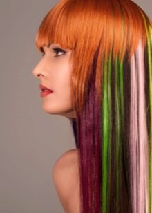 Inoltre, molte donne adottano un approccio complicato ai fili di pittura: colorano solo la frangia e lasciano il resto delle aree in colore naturale. Puoi cambiare radicalmente l'immagine con l'aiuto della colorazione al neon, in cui i riccioli sono dipinti in composizioni luminose, ma facilmente lavabili.