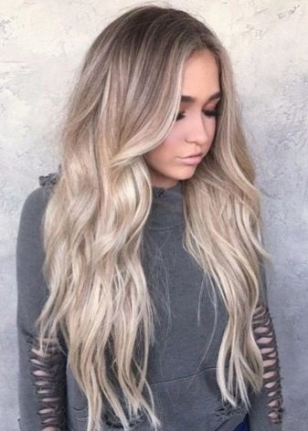 Un'ottima soluzione per lunghi capelli biondi sarà la tecnica di colorazione del balayazh. Per un tale dipinto, puoi scegliere sia tonalità infuocate che tenui con note di tinta di cenere. Puoi farlo da solo in questo modo: