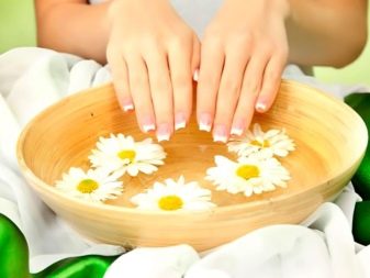 Per preparare un bagno con un decotto di erbe medicinali, avrai bisogno di una miscela di varie erbe, che possono essere acquistati in farmacia o raccolti in estate da soli. Per rafforzare, i fiori di camomilla, la bardana, l'erba di San Giovanni sono adatti. Aggiungi un cucchiaino di erba secca al contenitore e versaci sopra dell'acqua bollente, lascia fermentare per 10-15 minuti. Quando la temperatura del brodo diventa confortevole, abbassa le dita nel contenitore per mezz'ora. Dopo il bagno, asciugare le mani con un panno asciutto o un asciugamano, quindi utilizzare una crema nutriente idratante.