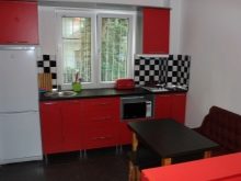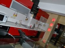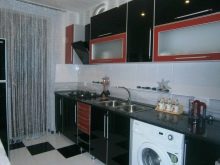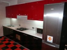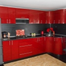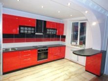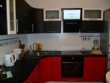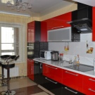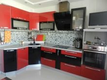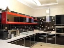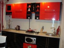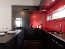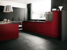 - Il design elegante della cucina in rosso e nero in combinazione con una camera spaziosa e soffitti alti non crea un'atmosfera pressante. Un'audace combinazione di moduli aperti di colore grafite e facciate laconiche scarlatte energizza, sembra affermare la vita.