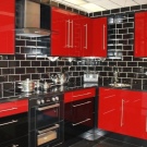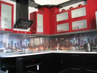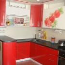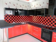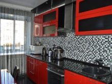 Se vuoi mantenere l'unità della combinazione di colori all'interno, puoi finire le pareti in nero o rosso. I rivestimenti a mosaico con una lucentezza lucida sembrano squisiti: non sono così monotoni e possono essere carbone saturo. Se nell'auricolare il colore principale è nero e solo la superficie di lavoro è rifinita in rosso, puoi aggiungere colori alla decorazione delle pareti, scegliendo tessuti per finestre, asciugamani, tovaglie per il tavolo da pranzo.