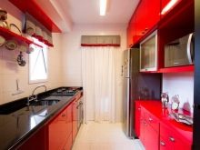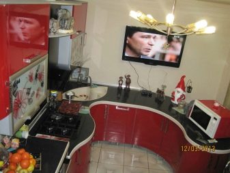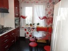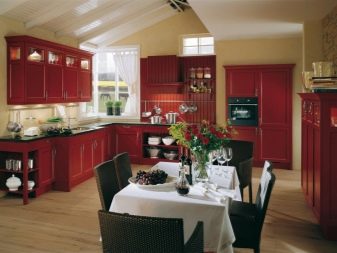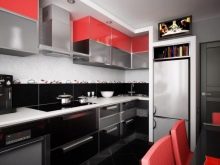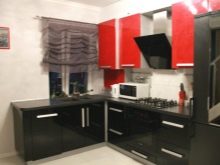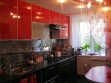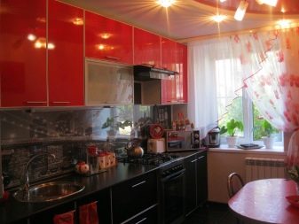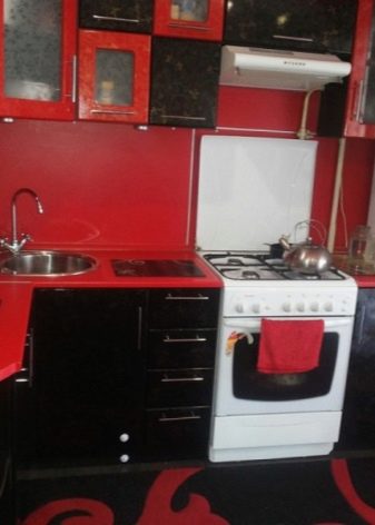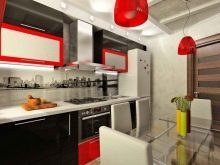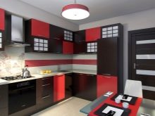 Gli elettrodomestici per interni nei colori rosso e nero possono essere grigio argento o acciaio, nero e persino bianco se gli stessi elementi sono presenti nel design degli interni stesso. Le aperture delle finestre possono essere decorate con persiane o persiane colorate corrispondenti.