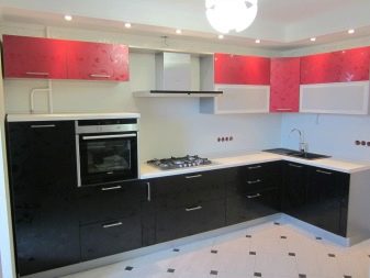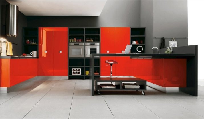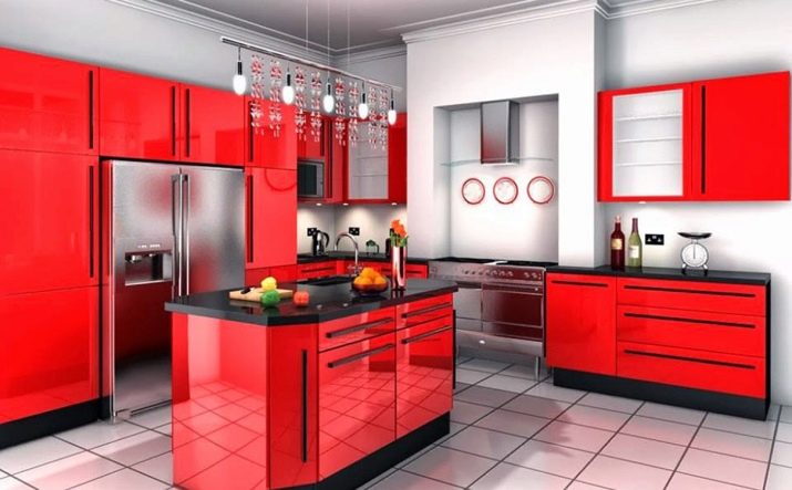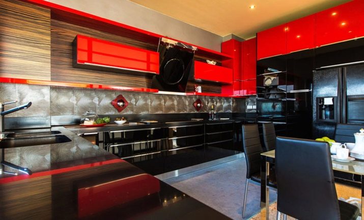 Combinare i colori in una cucina rossa e nera richiede molta arte ed esperienza. Di norma, qui vengono utilizzate combinazioni di contrasto, che distinguono chiaramente le zone funzionali. Ad esempio, un tono rosso può essere utilizzato per finire i controsoffitti. La parte inferiore e superiore degli armadietti potrebbero essere nere. I sistemi di stoccaggio scarlatto lucidi in combinazione con un piano di lavoro in carbone sembrano spettacolari.