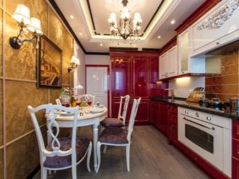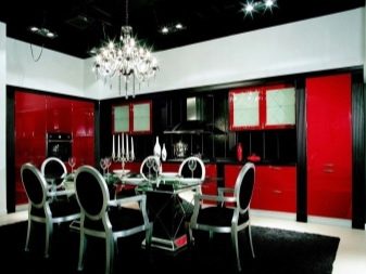 Creare un'illuminazione spettacolare all'interno di una cucina rosso-nera è semplicemente un must. Il vantaggio dovrebbe essere dato alle lampade a LED di aspetto e forma moderni, a soffitto o mortasa, punti originali. Nella sala da pranzo, il lampadario può essere sostituito con mini faretti multidirezionali: si adattano bene allo stile del loft o allo stile minimalista. In una cucina lucida in stile Liberty, puoi utilizzare un lampadario di cristallo come elemento principale di illuminazione e applique alle pareti.