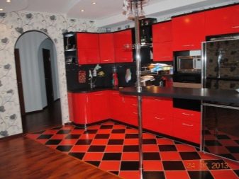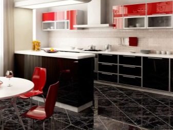 Nella decorazione del pavimento in cucina con un set nero e rosso, sono consentiti sia la posa di scacchi monofonica che bicolore, i domino con una disposizione di elementi a forma di diamante. Nella versione monocromatica, viene accolto solo un tono carbone senza transizioni. La scelta migliore sarebbe piastrelle lucide o parquet all'ombra di wenge scuro, moka.