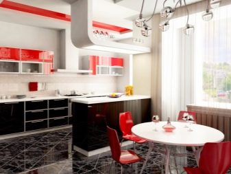 Una soluzione popolare è la parte superiore rossa e la parte inferiore nera dell'auricolare. In questo caso, puoi includere nella sua decorazione un controsoffitto bianco e bordi pensili vetrati. Ciò diluirà l'eccessivo rigore e contribuirà a rendere il kit di contrasto più versatile. In combinazione con un pavimento lucido con piastrelle in marmo nero e pareti bianche, puoi ottenere una cucina molto luminosa senza un accenno di oscurità. Nella sala da pranzo per supportare la scelta del design scelto aiuterà una tavola rotonda bianca con sedie rosse.