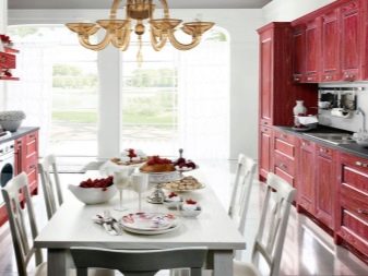 Lo stile raffinato e leggero della provincia francese può anche essere incarnato nei colori rosso e nero contrastanti. Solo il tono di base sarà uno squisito colore del vino vicino al bordeaux, e solo il piano di lavoro rimarrà nero. Le tonalità mute si adattano bene all'interior design in una casa di campagna. Il grembiule qui può essere lasciato naturale, in legno, le pareti in legno chiaro sottolineano armoniosamente la raffinatezza dell'arredamento. Un dettaglio luminoso saranno gli accessori in rame o bronzo degli armadietti.