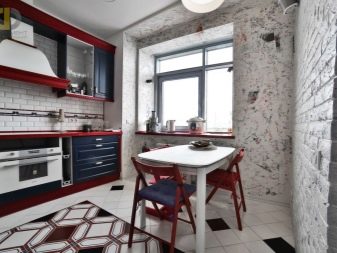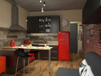 Un buon modo per adattare una cucina rossa e nera all'interno è quello di scegliere uno stile loft per questo. In questo caso, l'arredamento delle facciate sarà rosso, con un bordo a contrasto, le pareti sono in mattoni, la parte a parete della cuffia è realizzata come una classica scaffalatura o credenza senza strutture a cerniera, in nero. Un ampio soppalco è caratterizzato dall'uso di una cuffia a forma di U o a forma di isola.