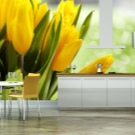 Le foto di fiori creano un'atmosfera di tenerezza. Se la cucina è spaziosa, puoi decorarla con immagini macro di lusso peonie o rose. Riempi la stanza con il caldo estivo camomilla su uno sfondo di vegetazione lussureggiante. Sembrano aggraziati e gentili tulipani.