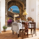 La scelta migliore per una piccola stanza è una foto di un'accogliente strada italiana o francese, sepolta tra i fiori degli alberi, o un sentiero che conduce a un giardino ombreggiato. Scegli le immagini con l'effetto presenza che aumenta visivamente lo spazio.