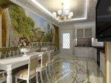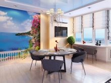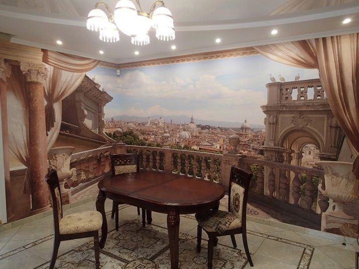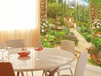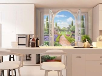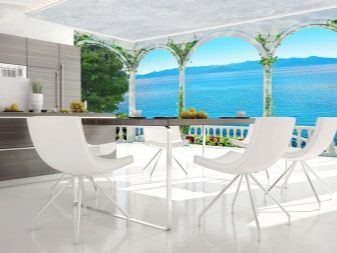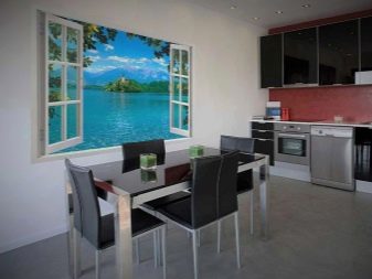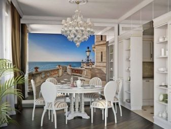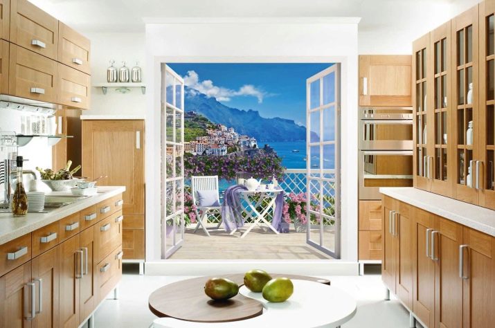 Puoi "continuare" visivamente la stanza con una veranda vetrata o un ampio balcone. Le antiche terrazze a colonna si adattano perfettamente agli interni classici. Le opzioni moderne possono simulare una vista di una città, un mare o delle montagne moderne dalla loggia o creare immagini futuristiche di stanze e tunnel aggiuntivi. Una tela del genere sembrerà particolarmente impressionante se il rivestimento del pavimento raffigurato su di esso corrisponde al colore del pavimento reale della tua cucina.