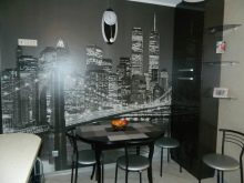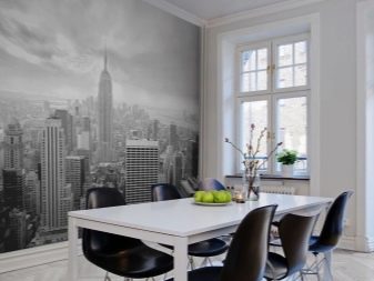 Foto e disegni grafici in bianco e nero sono appropriati in qualsiasi interno moderno. L'argomento delle immagini è diverso. La scelta a favore di un design così limitato della carta da parati fotografica può essere fatta se la cucina ha molti accenti luminosi o semplicemente preferisci un design rigoroso.