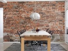 Tutte le opzioni sopra richiedono spazio libero. Se l'immagine viene bloccata da un frigorifero, un armadio, un divano o altri mobili enormi, l'effetto dell'arredamento andrà perso. Tuttavia, ciò non si applica agli sfondi che imitano le trame di vari materiali. Con il loro aiuto, puoi creare l'aspetto della decorazione con mattoni bianchi o rossi, pietra, legno, bambù e persino pelle.