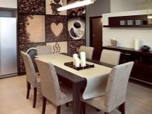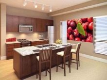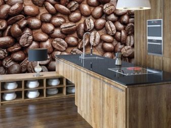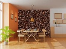 Alcuni credono che qualsiasi immagine in cucina dovrebbe aumentare l'appetito. Nel caso di un interno classico, può essere una natura morta squisita. Il design moderno si integra efficacemente frutti succosi in spruzzi d'acqua, bacche golose in crema. Gli amanti delle bevande corroboranti possono scegliere uno sfondo con una foto chicchi di caffè.