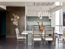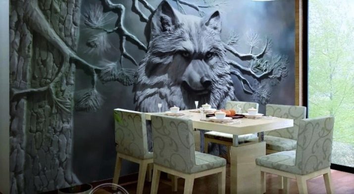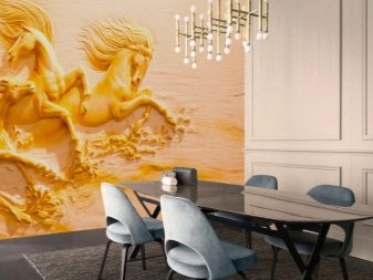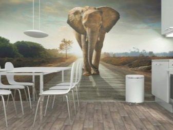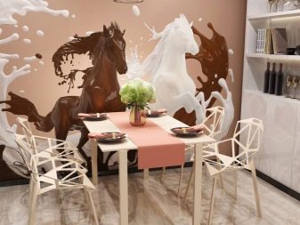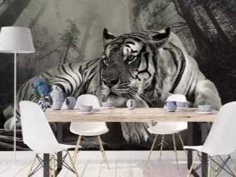 Separatamente, vale la pena evidenziare i murales raffiguranti animali. Per la cucina, questa scelta non è tipica, ma se lo si desidera, questa opzione può essere inserita armoniosamente all'interno. Nella spaziosa cucina-sala da pranzo, i graziosi cavalli da corsa o una tigre che riposa in pace possono sembrare spettacolari. Particolarmente impressionanti sono le immagini 3D in cui la bestia sembra guardare i presenti dalla tela o vuole uscire da lì.