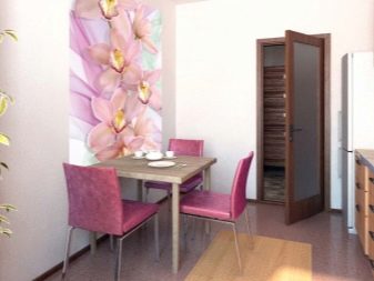 Se la cucina è piccola, le immagini macro (soprattutto i colori vivaci) non dovrebbero essere scelte. In casi estremi, puoi rimanere sullo sfondo, dove su uno sfondo monofonico leggero raffigura un rametto di orchidea o magnolia di una leggera sfumatura. In questo caso, dovrebbe prevalere lo sfondo. Quindi puoi evitare l'effetto della "pressione" di oggetti di grandi dimensioni in uno spazio angusto, mantenere la sensazione di leggerezza degli interni.