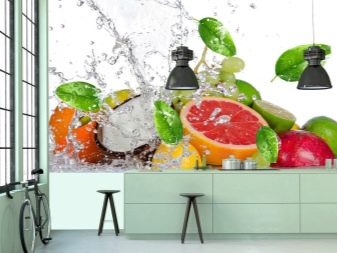 Quando si sceglie, è importante ricordare le dimensioni della stanza, poiché la macrofotografia è tipica di questo tipo di carta da parati. "Raggruppa" una piccola cucina con un'abbondanza di enormi bacche o arance non ne vale la pena. È meglio scegliere l'opzione in cui diversi oggetti sembrano congelarsi nell'aria.