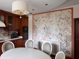 Un tipo interessante di carta da parati fotografica è un'imitazione delle riproduzioni di dipinti. Puoi decorare la cucina con una foto di un artista famoso, schizzi moderni o un disegno in stile giapponese. A seconda della trama, la tela può occupare l'intera parete o solo una parte di essa. Per una maggiore affidabilità, è possibile emettere una cornice di "riproduzione". Nello stesso gruppo possono essere attribuiti sfondi in stile retrò, ad esempio con timbri.
