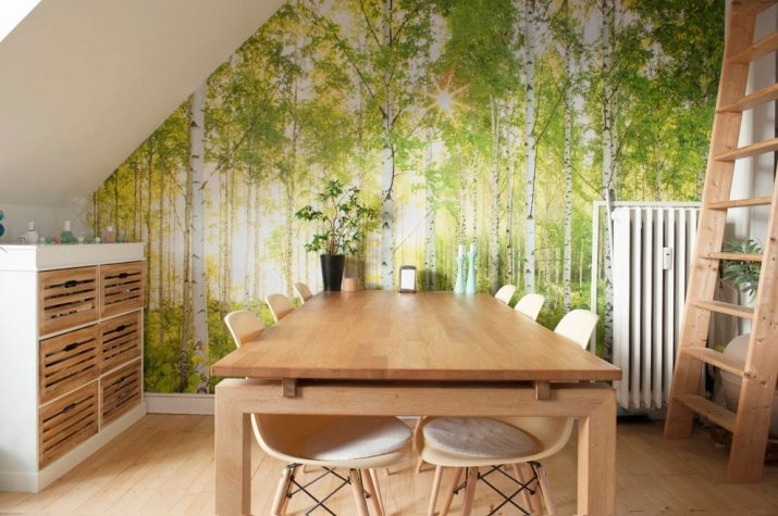 Una foto di un boschetto di betulle è una decorazione ideale per una casa di campagna. Tali sfondi si adatteranno anche allo stile country.